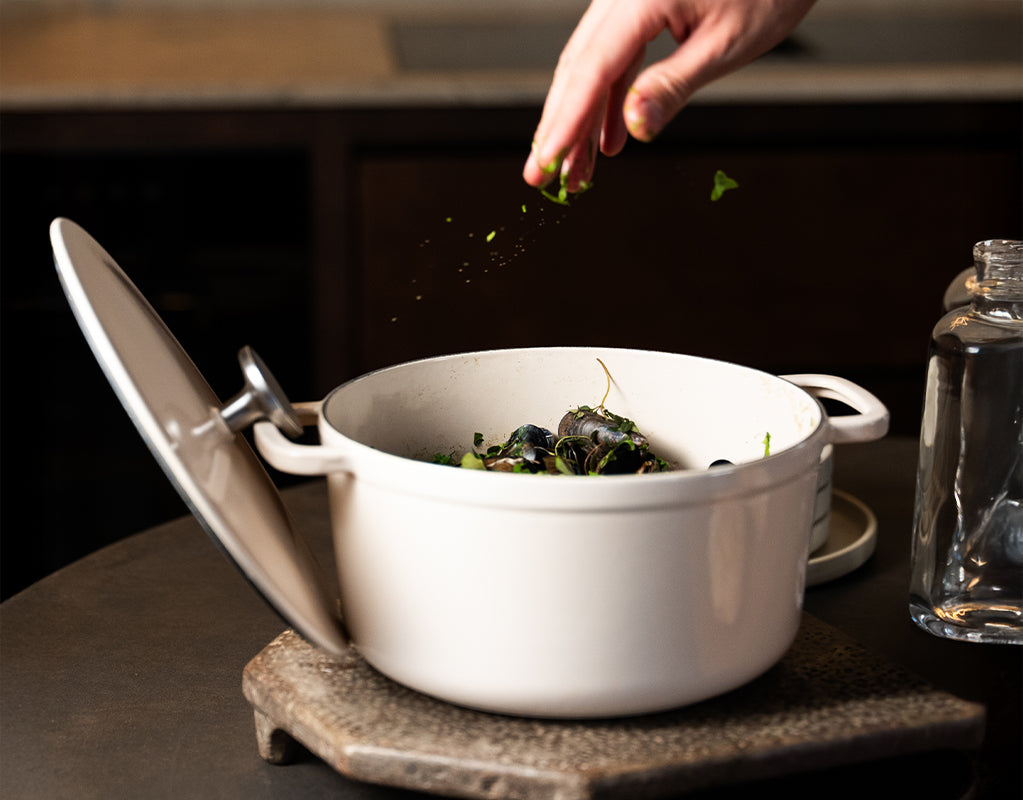 Og så bliver det jo endnu mere appetitvækkende at servere muslingerne fra en smuk gryde.