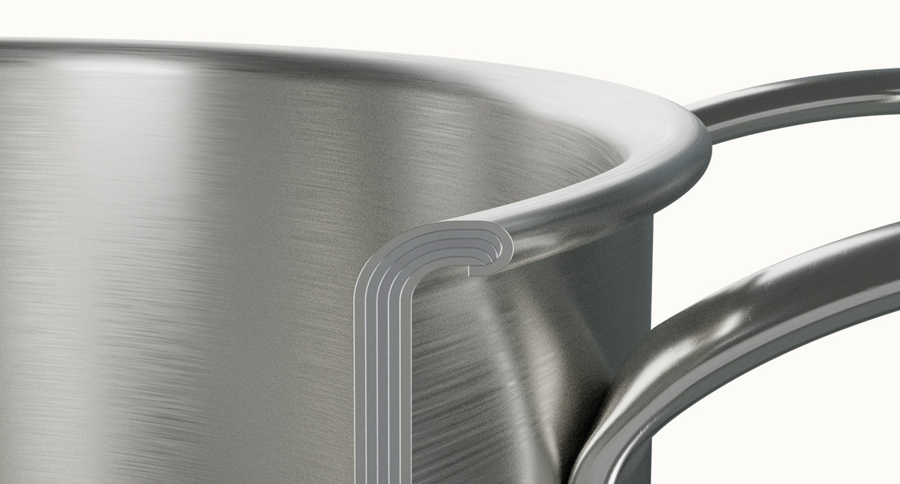 Disse tre lag består af to lag i rustfrit stål - med en kerne af aluminium, som giver gode varmeegenskaber.