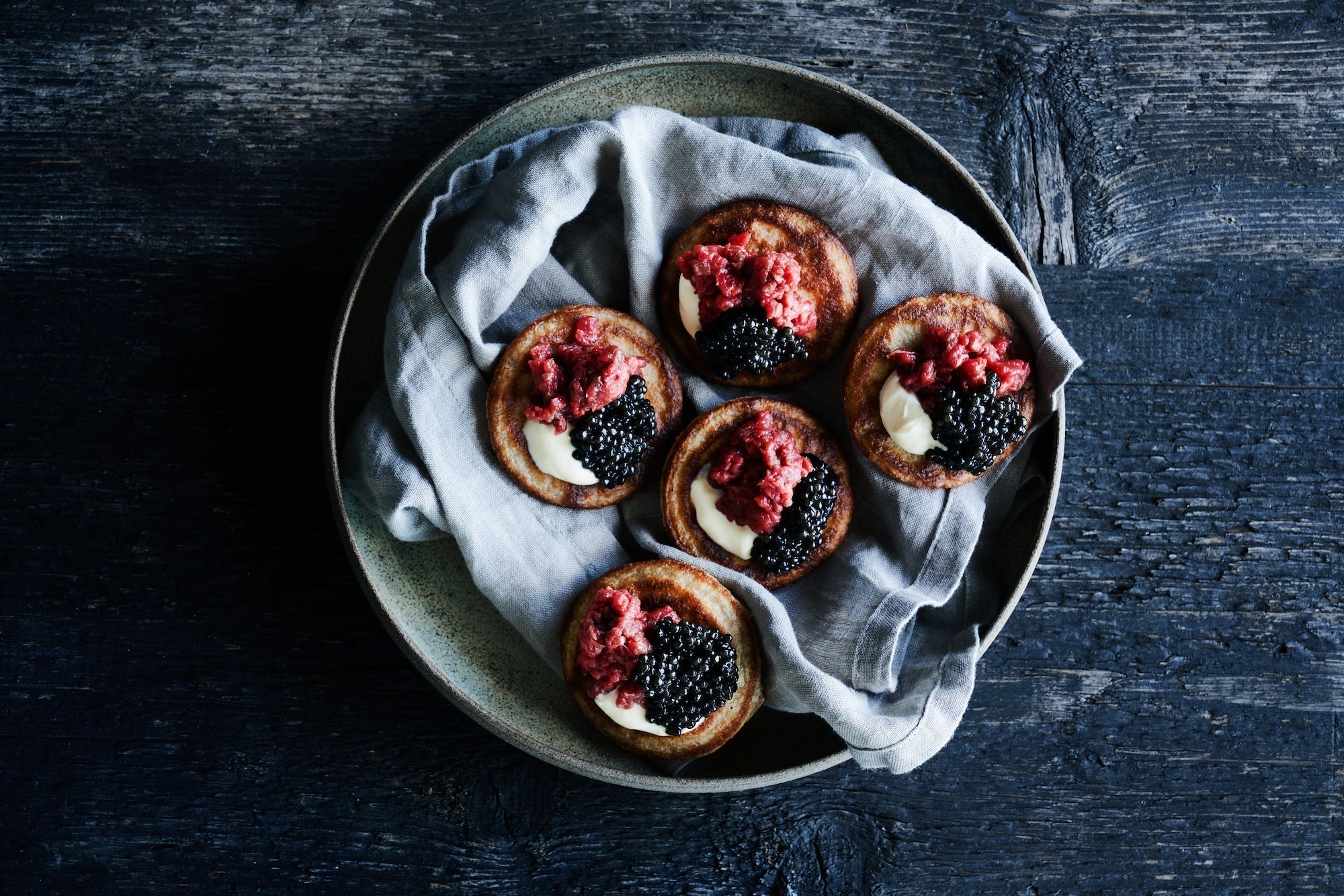 Blinis med caviar, cremefraiche og tatar