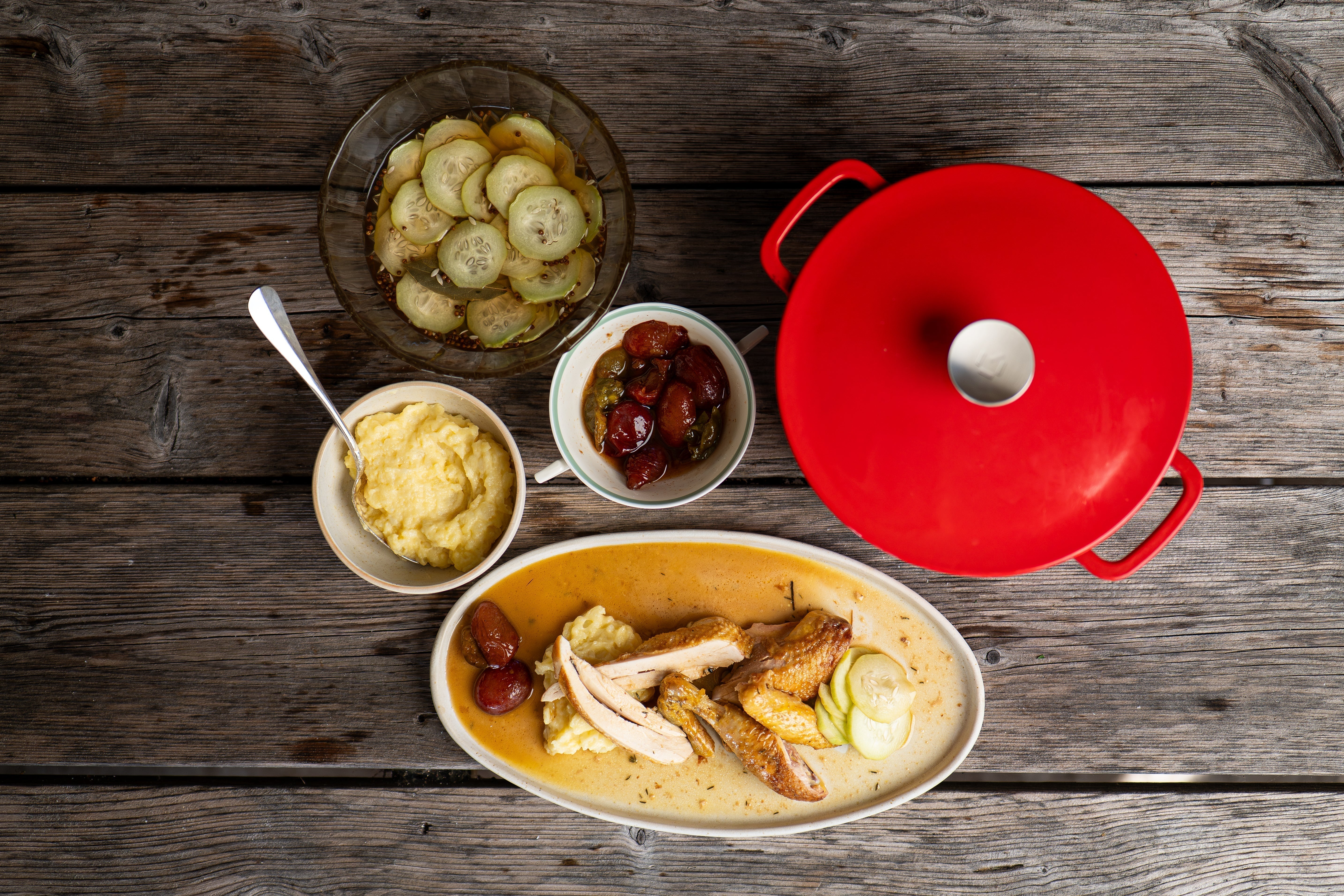 Anret kyllingen på et fad med den skiltede sauce hældt over. Giv kartoffelmos til, og server med syltede agurker og syltede blommer – det søde, syrlige og fede spiller sammen og løfter retten til noget helt særligt.