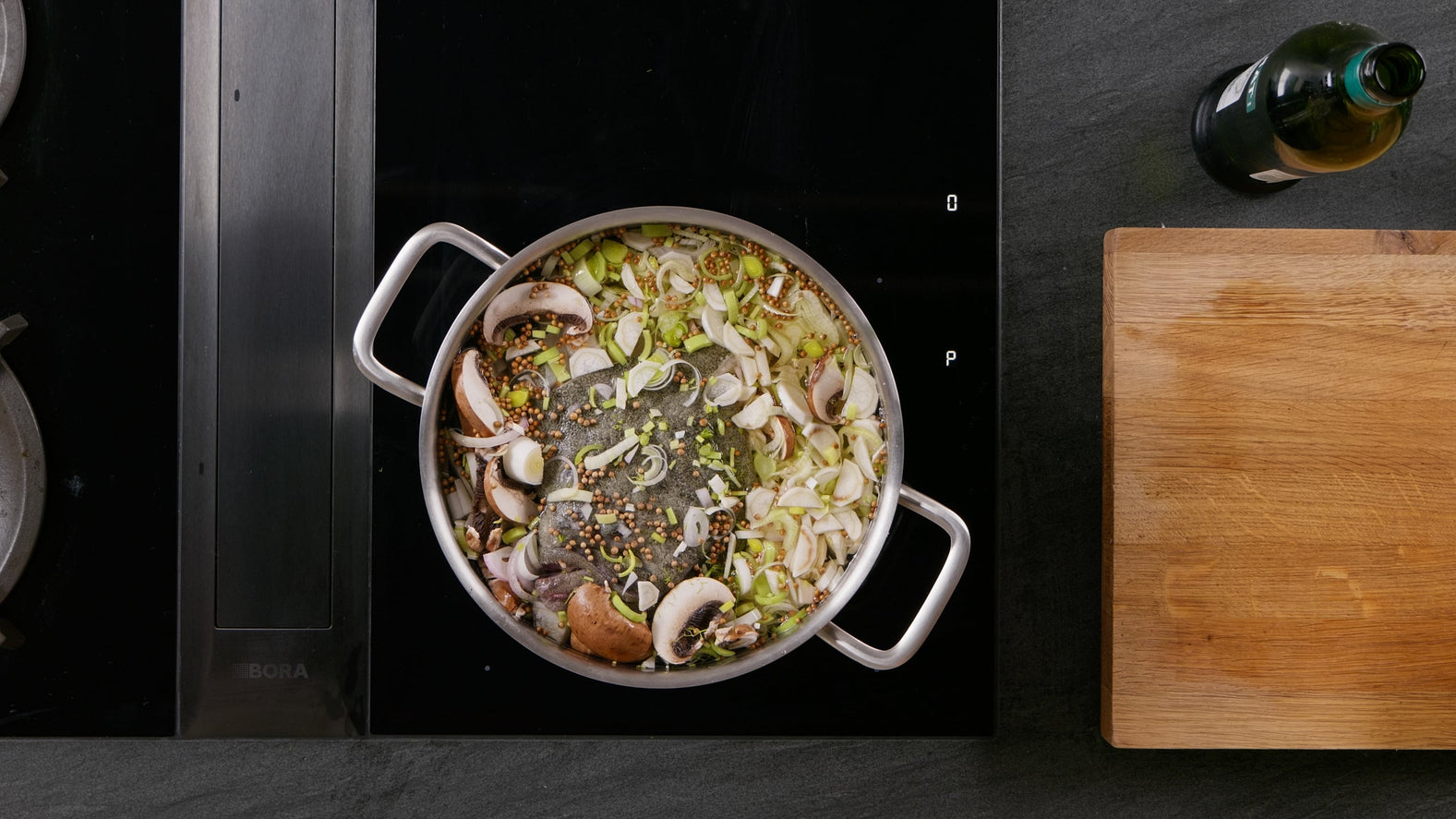 Læg det brændte skalotteløg, laurbær, timian og hvidløg i gryden sammen med kyllingen.