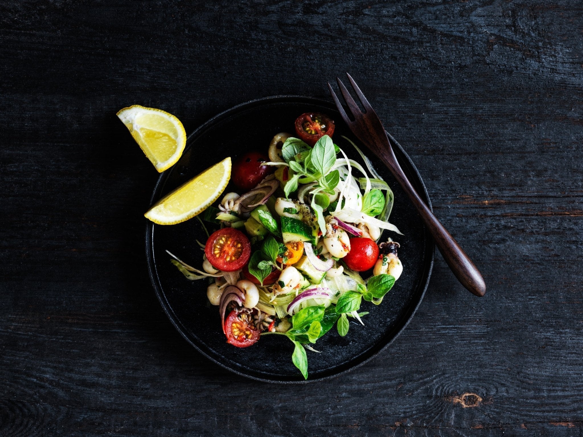Lun blækspruttesalat med tomat, rødløg og urter