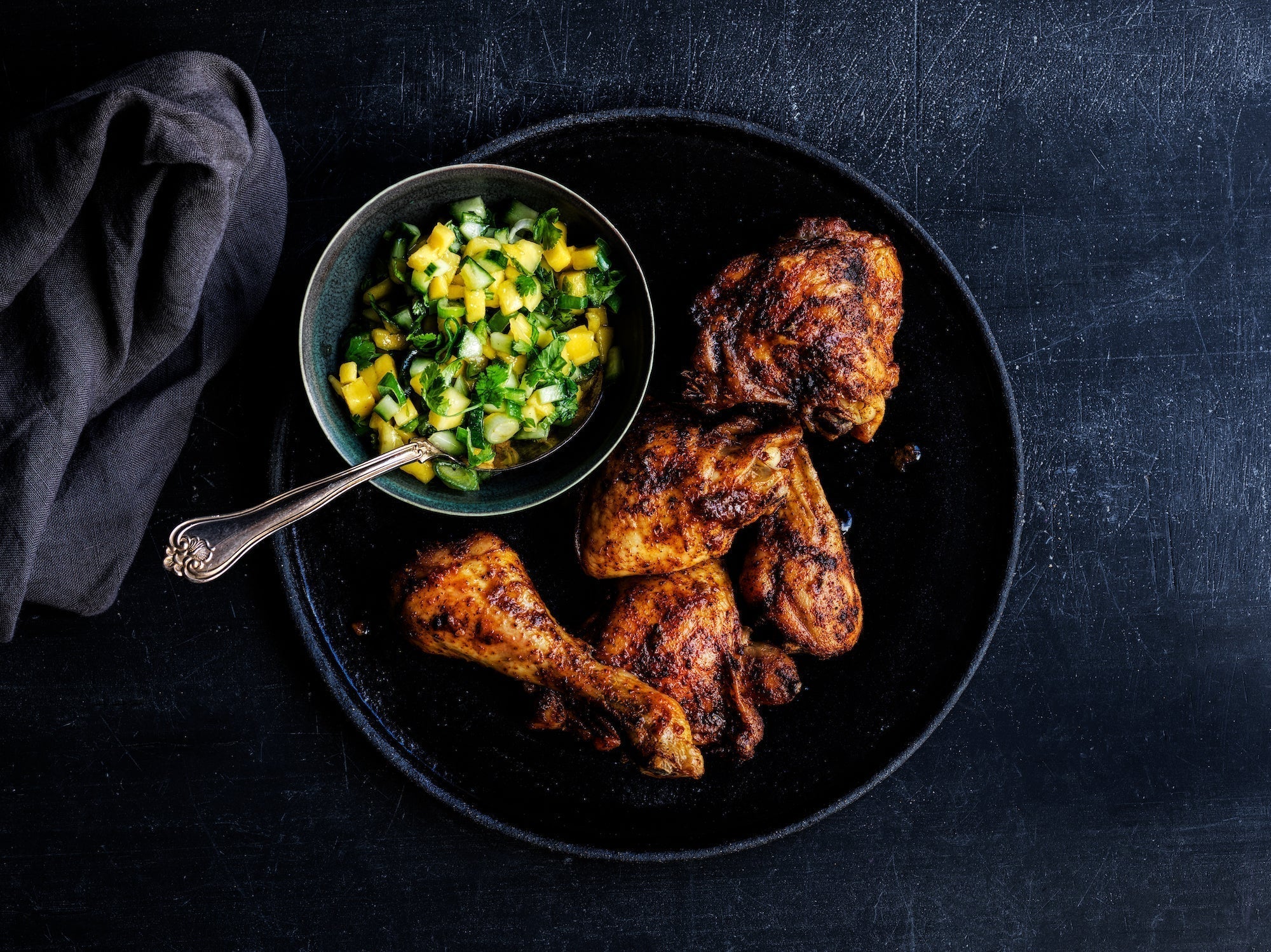 Kyllingen får selskab af en frisk og spicy mangosalsa med forårsløg og koriander. Den smager i øvrigt også godt med en bunke sweet potato fries på siden.