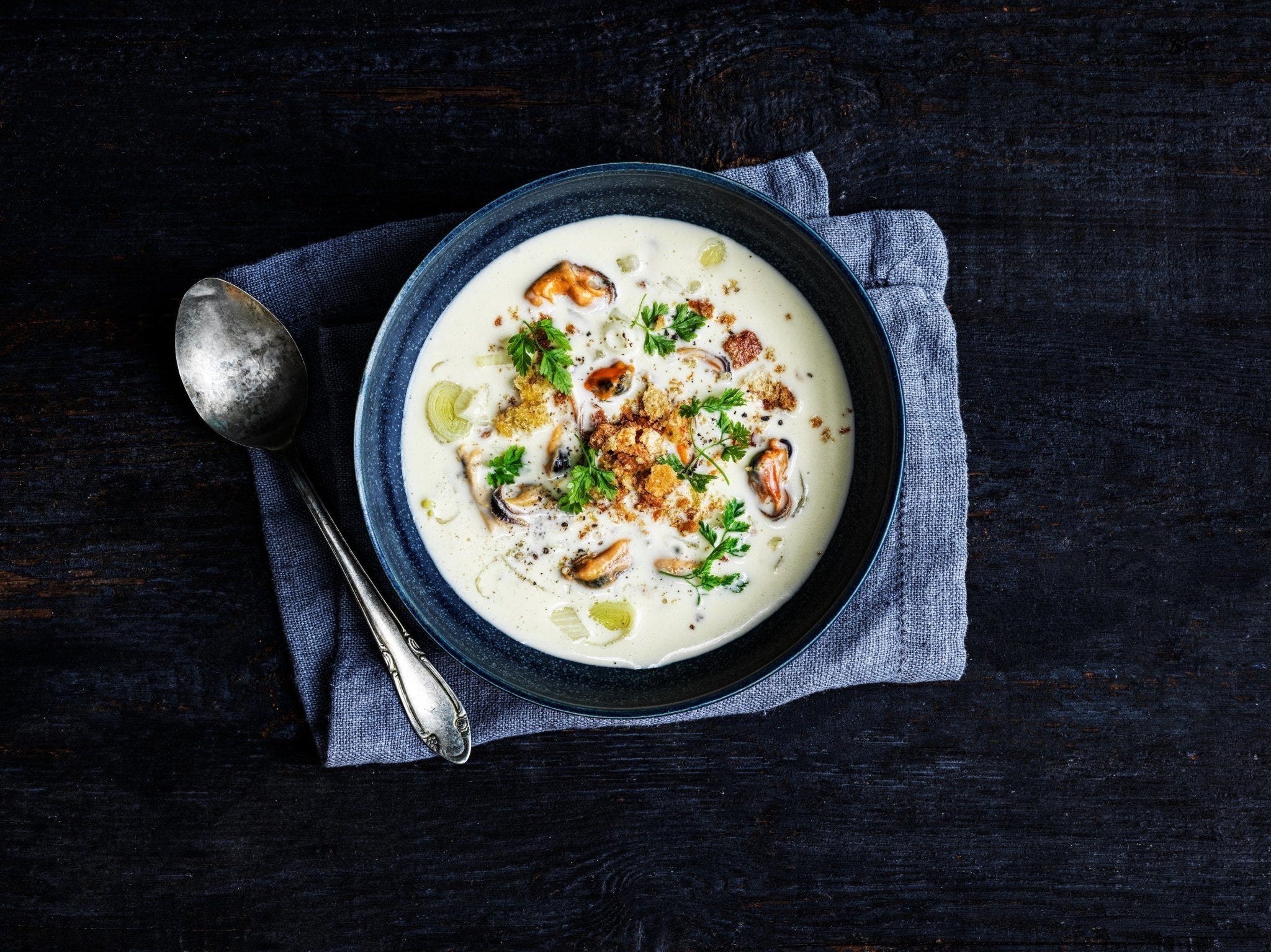 Skøn og cremet suppe med blåmuslinger, hvidvin og fløde samt grønt. Retten fungerer glimrende som forret, når menuen skal være ekstra festlig som eksempelvis på årets sidste aften.