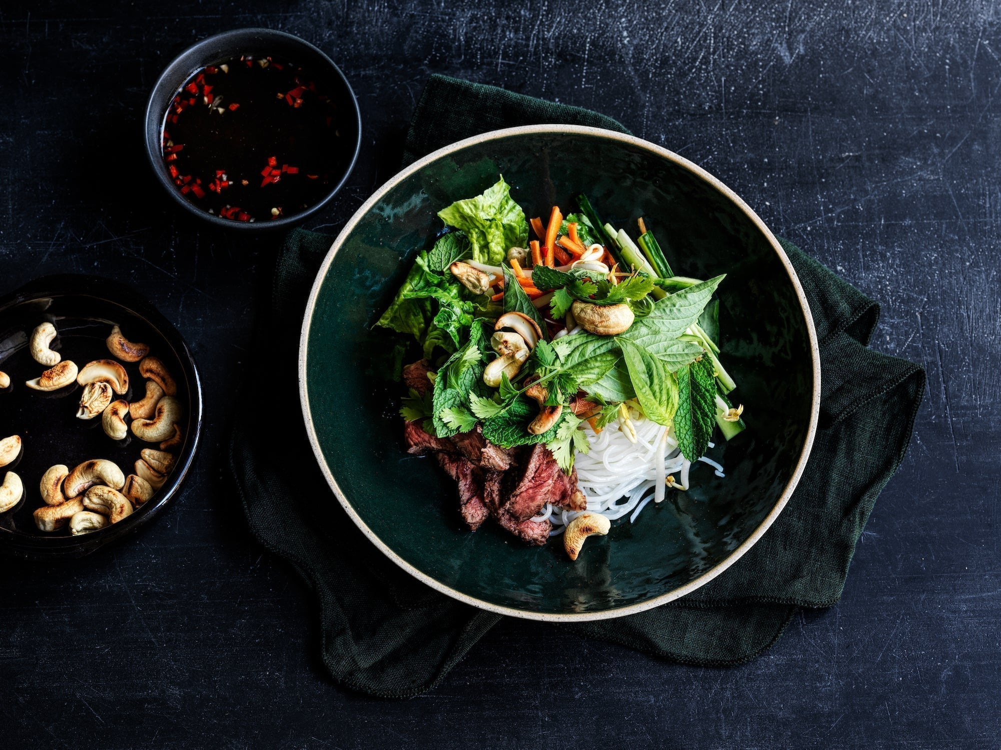 Nudelsalat med steak, peanuts, urter og asiatisk dressing