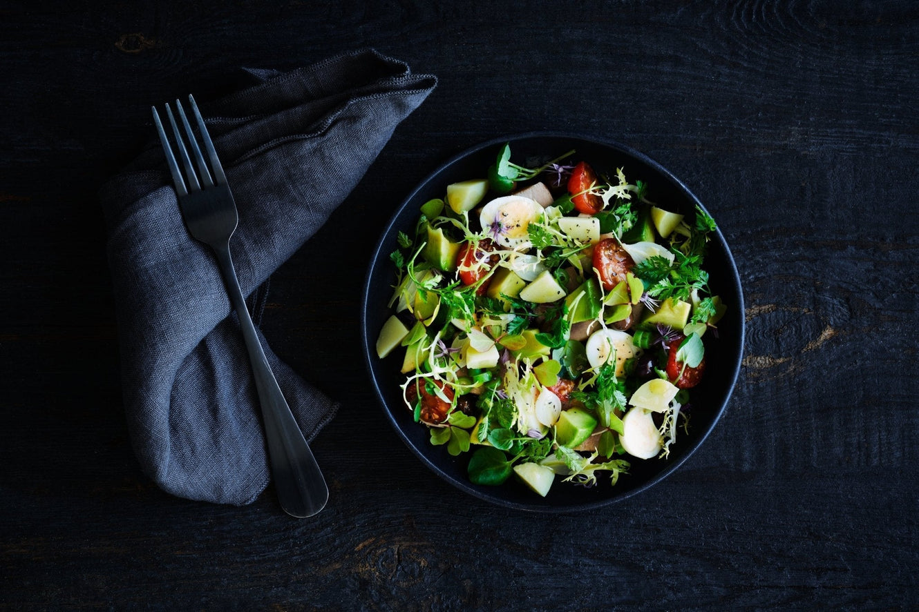Skær agurken i strimler, snit salaten, og pluk urterne.