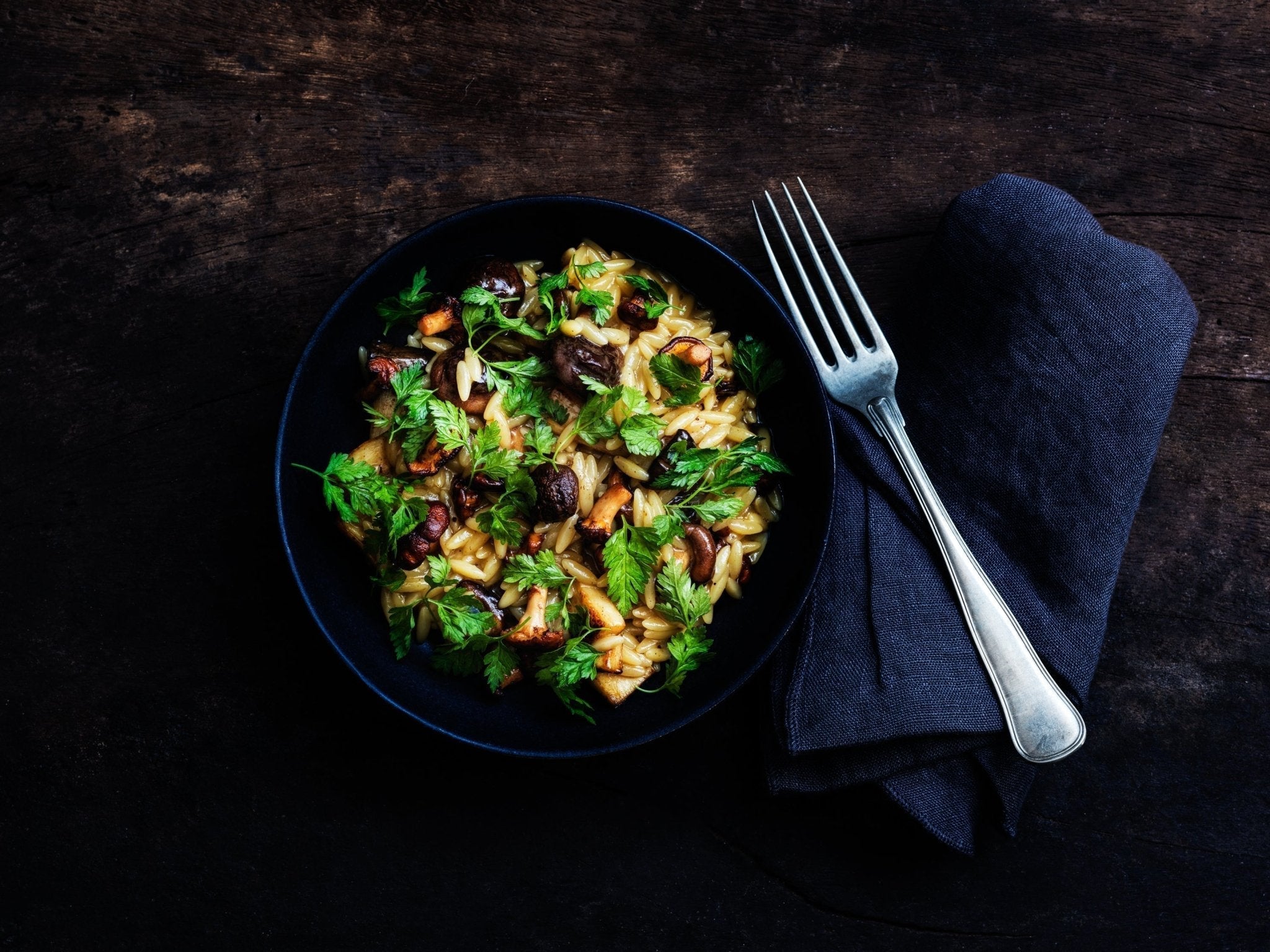 Risoni, som også går under navnet orzo, er en slags pasta, der ligner riskorn. Du finder den i velassorterede supermarkeder sammen med pastaen. Du kan blandt andet bruge den som her i stedet for ris i en risotto. I denne version får den selskab af blandede svampe, parmesan og kørvel.