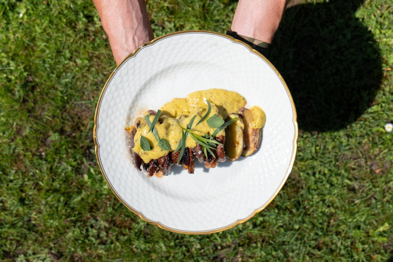 Når skindet er sprødt, slukkes komfuret, brysterne vendes og steger færdigt i 1-2 minutter. Herefter skal de hvile i ca. 10 minutter på en rist.