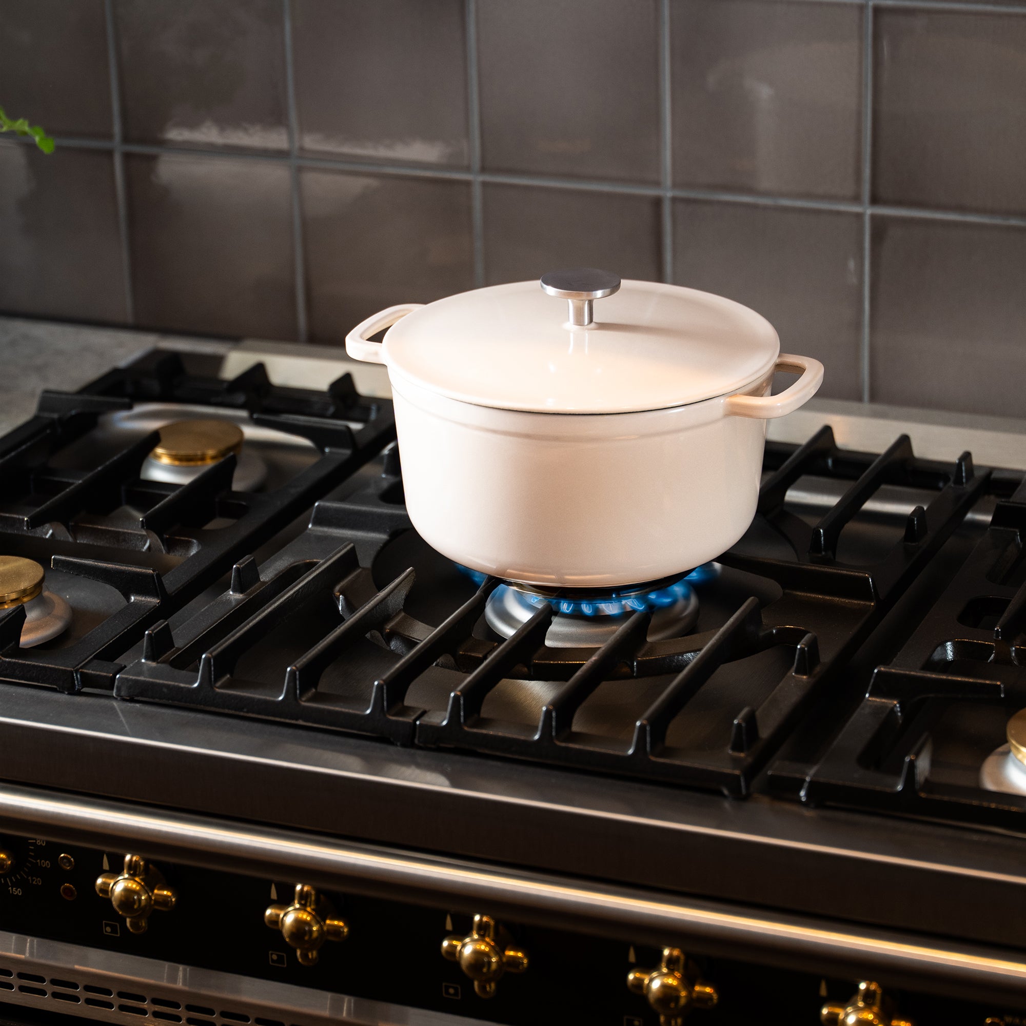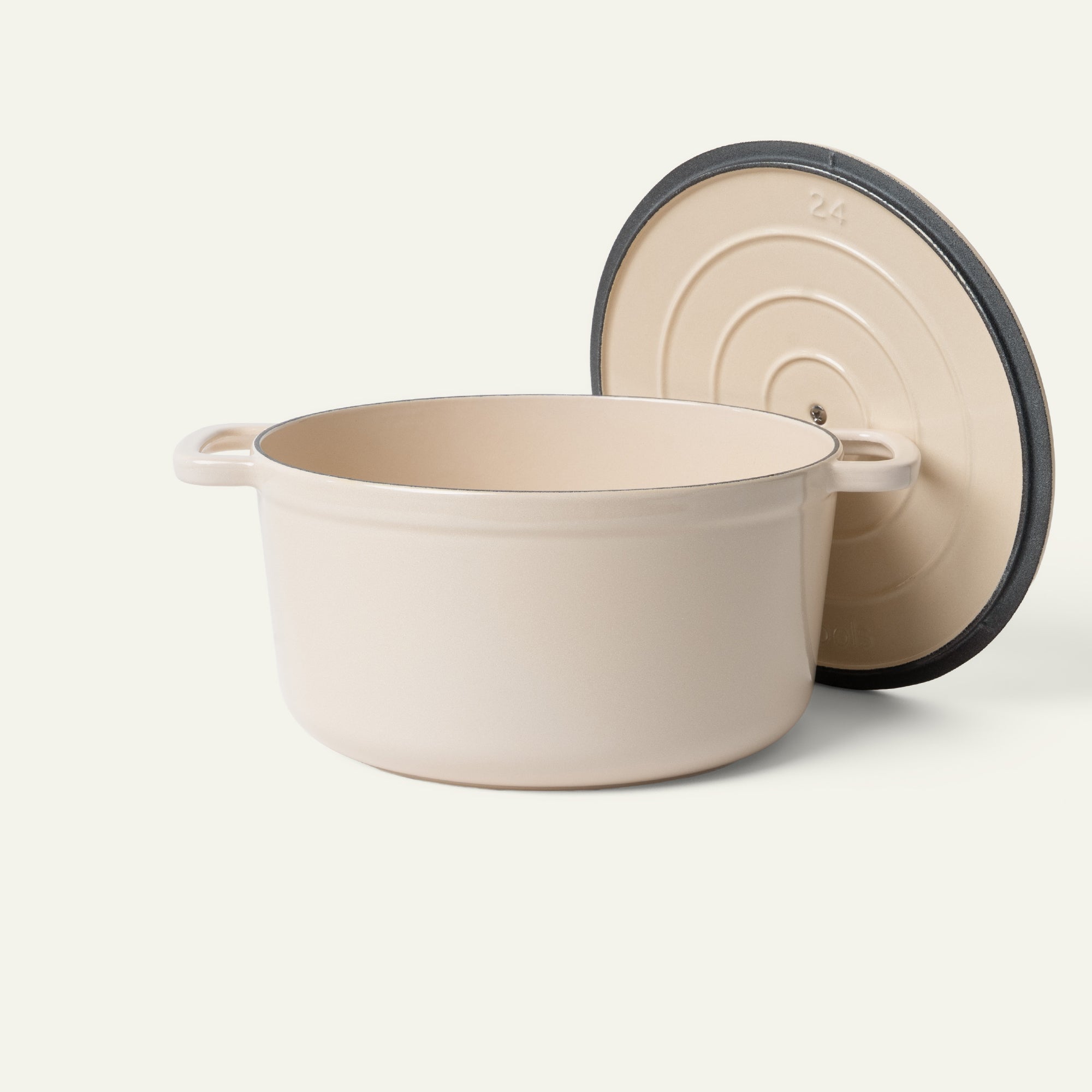 Den rigtige støbejernsgryde køber du kun én gang i livet, og derfor er vi ikke gået på kompromis, hverken i produktion, materialer eller design. Vores gryde produceres hos en fransk virksomhed, der siden 1920’erne har skabt støbejernsprodukter i absolut topkvalitet. Her bliver hver gryde støbt i en individuel sandform af op til 80 % genanvendte materialer. Emaljeringen udføres i hånden af erfarne eksperter, så overfladen bliver så stærk som muligt. Det er nemlig i kvaliteten af emaljen, forskellen på støbejernsgryder viser sig tydeligst — ikke i morgen, men om mange år, når gryden stadig leverer perfekte resultater, gang på gang.