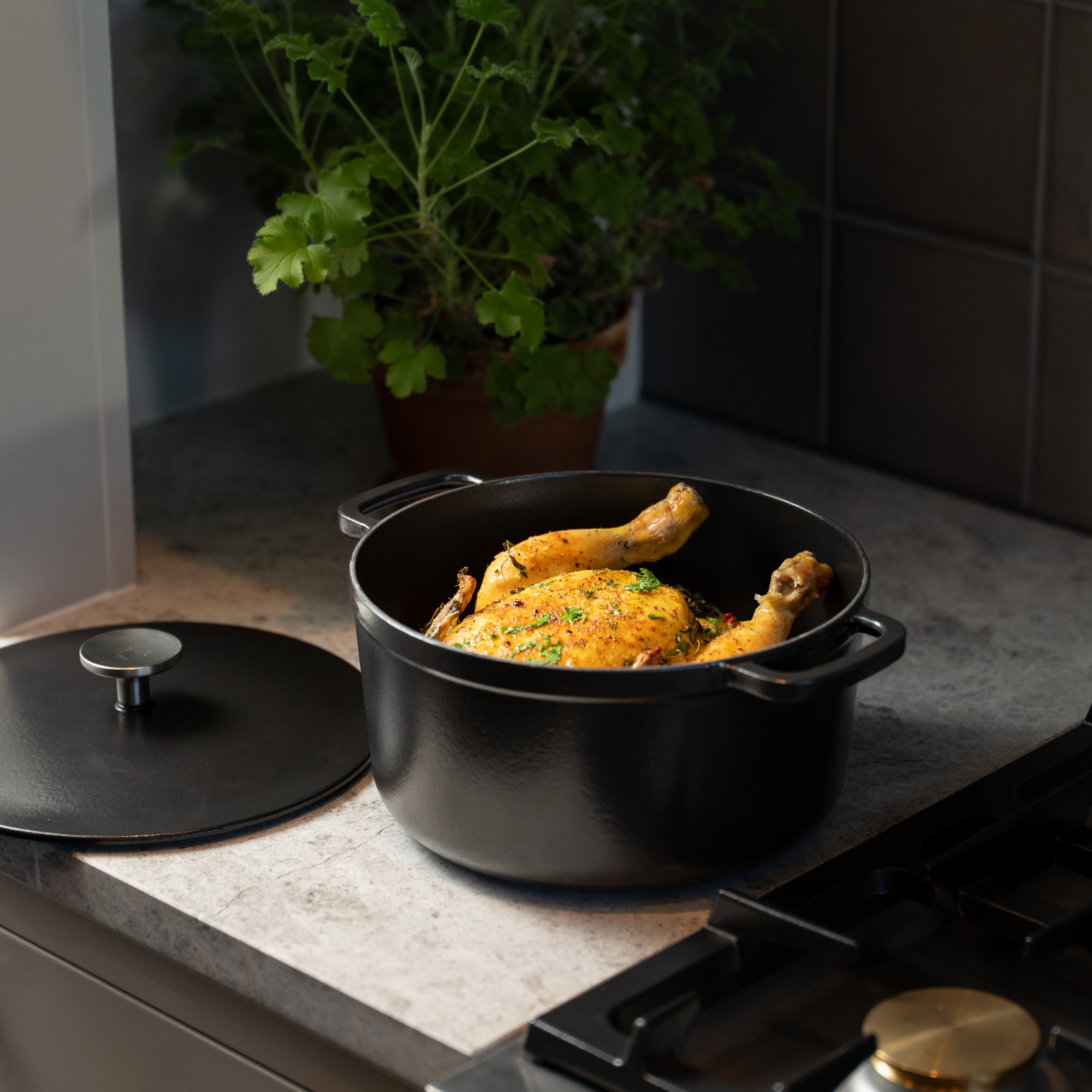 Tykkelsen på støbejernsgryden giver den perfekte balance mellem temperaturkontrol og varmelagring. Støbejernet holder på varmen, så du kan skabe fantastiske stegeskorper og samtidig bruge mindre energi, når din gullasch skal langtidssimre. Du kan også udnytte varmelagringen til at holde din mad varm længere ved servering. Brug det alsidige stykke køkkenværktøj til at stege, simre, braisere, bage og dampe – selvfølgelig uden risiko for PFAS og tungmetaller i maden.