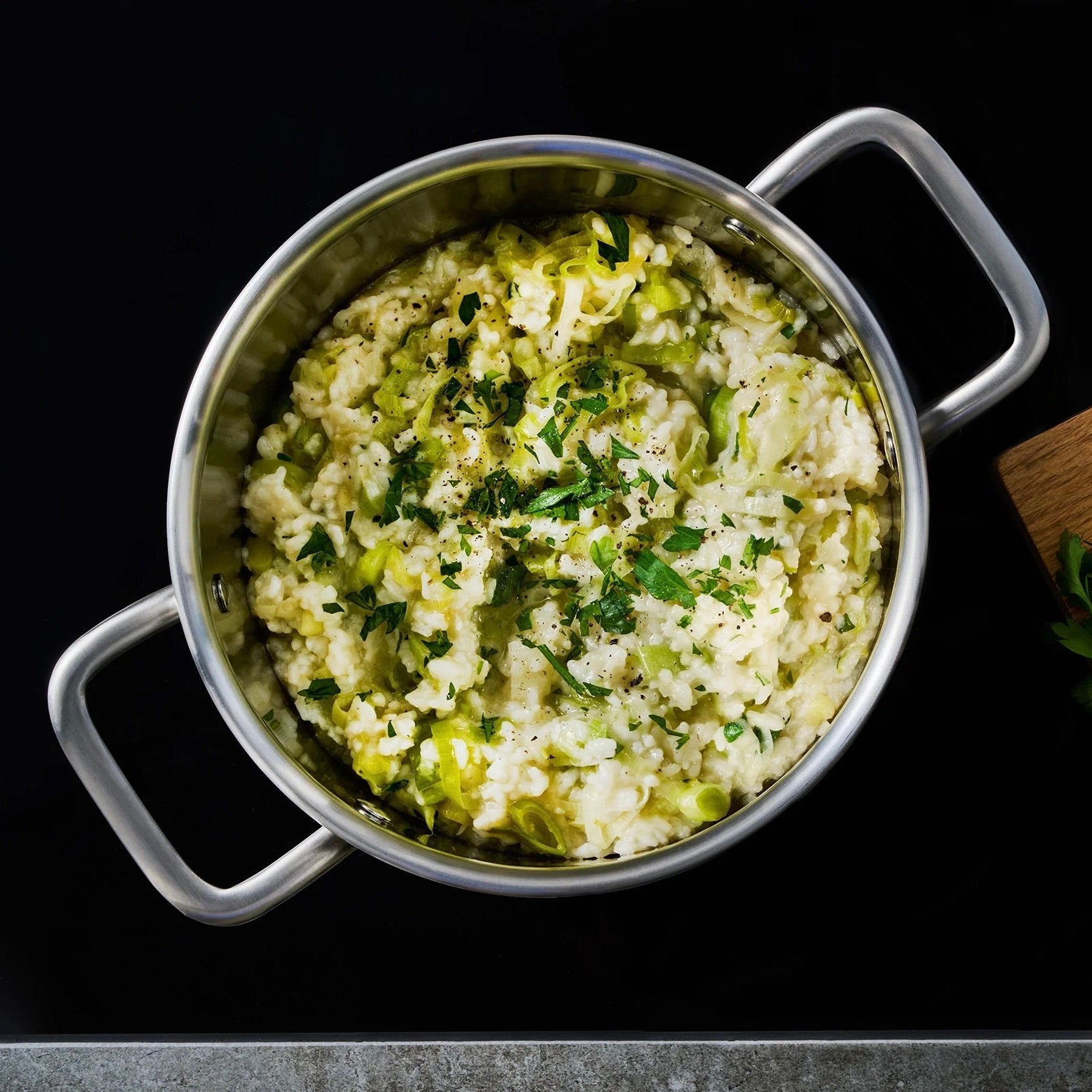 Du opnår en effektiv varmekontrol takket være kernen af aluminium, der har en sublim varmeledning og giver dig mulighed for hurtigt at hæve eller sænke temperaturen i gryden. Modsat kogegrej med en påsat sandwichbund, vil du opleve, at varmen naturligt spreder sig op langs grydens kant, fordi hele gryden består af 5-ply - ideelt til retter som risotto og simreretter.