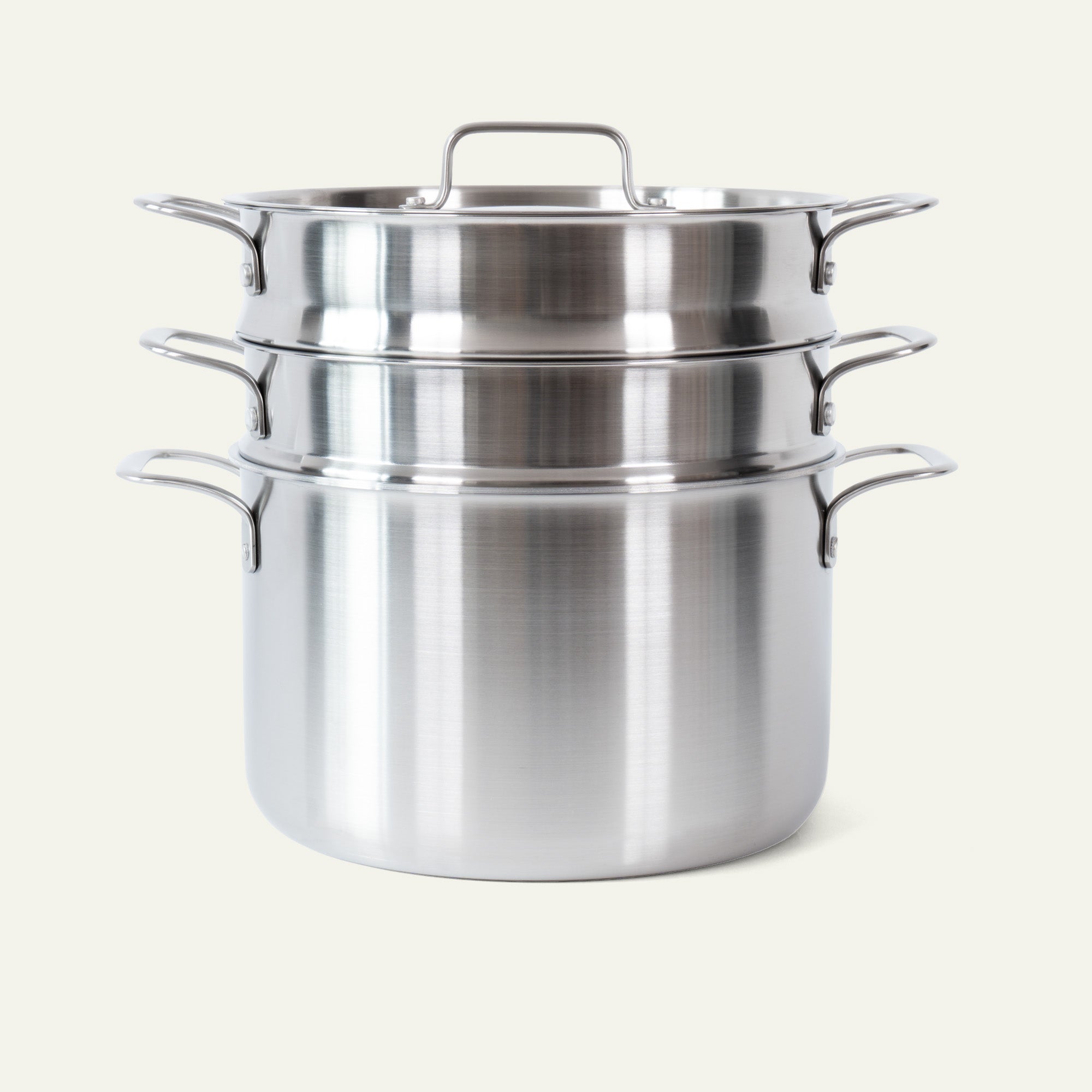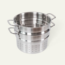 En pasta- og dampindsats er den ideelle opgradering til din gryde i 5-ply. De robuste håndtag på indsatserne gør det nemt at sænke dem ned i spilkogende vand eller i en dampende gryde uden at brænde sig, og lige så nemt at løfte dem op, når maden er færdig. Og skal du skylle indholdet i koldt vand for at stoppe tilberedningen, kan du let løfte indsatsen over under den kolde hane. Perfekt til pasta, dumplings eller saftig fisk.