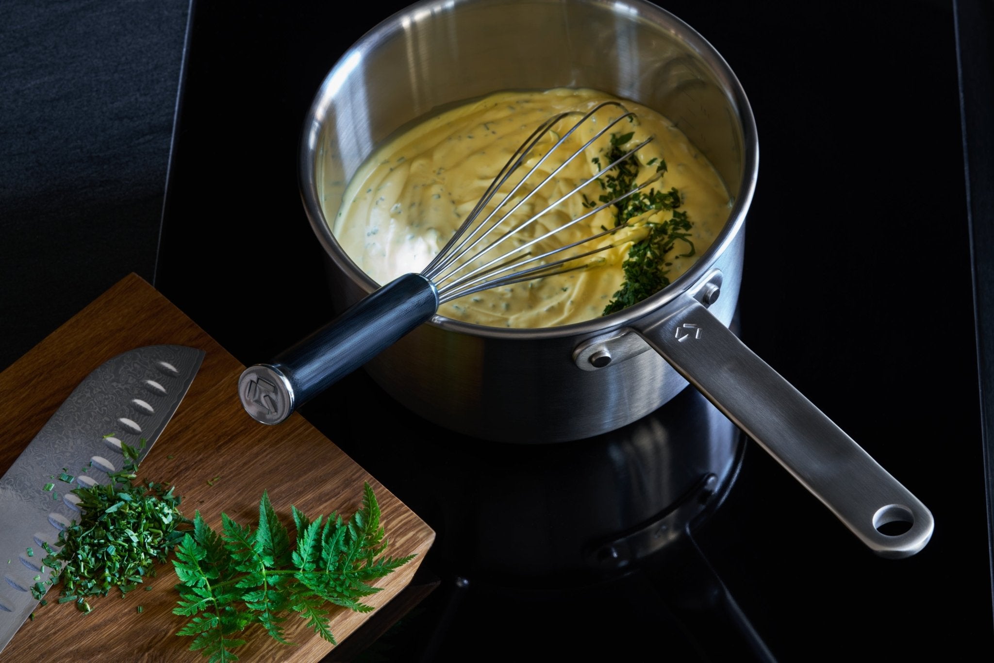 Du opnår en effektiv varmekontrol takket være kernen af aluminium, der har en sublim varmeledning og giver dig mulighed for hurtigt at hæve eller sænke temperaturen i kasserollen. Modsat kogegrej med en påsat sandwichbund, vil du opleve, at varmen naturligt spreder sig op langs kasserollens kant, fordi hele kasserollen består af 5-ply - ideelt til at legere cremer og piske saucer.