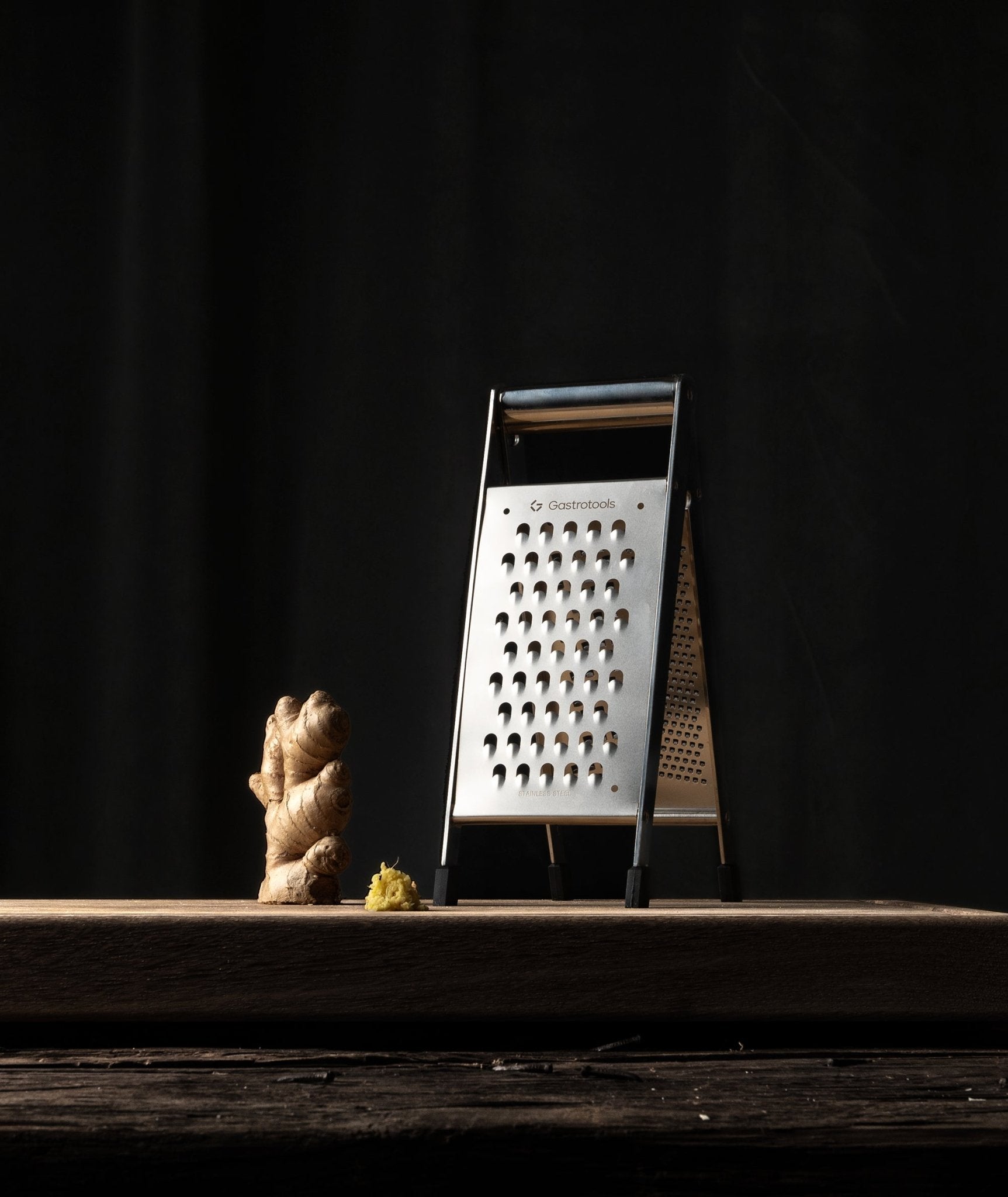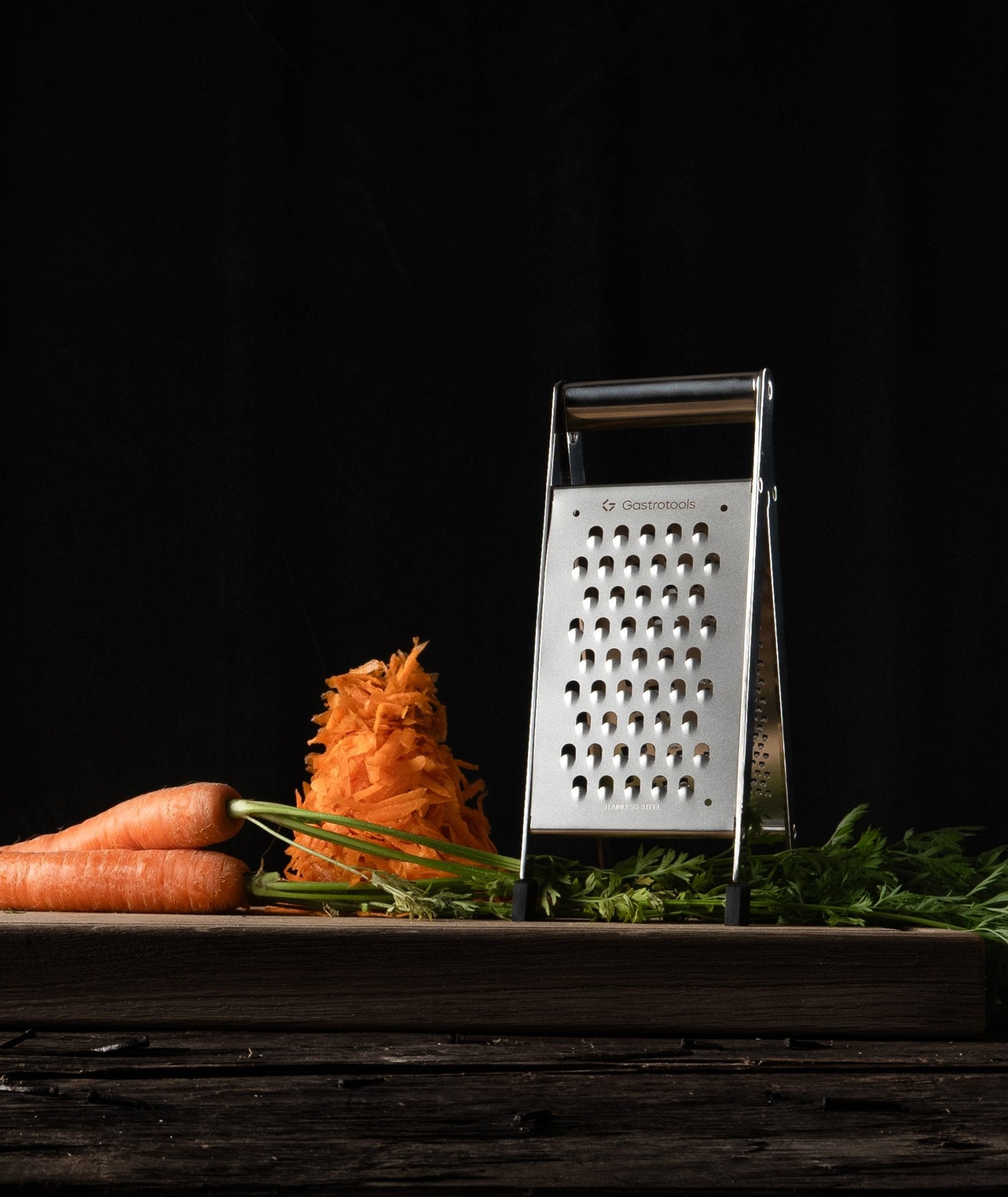 Gastrotools' ultraskarpe folde-rivejern i rustfrit stål har 3 riveoverflader: fin, medium og grov. A-ramme-designet giver mulighed for let og stabil rivning, mens gummifødderne forhindrer det i at glide. Kanterne på rivejernet er skåret med laser, så de bliver utroligt skarpe sammenlignet med traditionelle standsede rivejern.